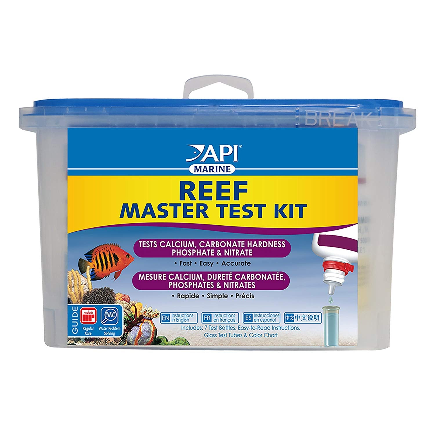 The API REEF MASTER TEST KIT tests 4 key parameters – calcium, carbonate hardness, phosphate, and nitrate – to keep reef inhabitants healthy. Testing is fast, easy, and accurate, yielding precise results, and comes with 4 glass test tubes with snap-tight caps and a convenient holding tub for easy, reusable storage. This kit also includes a complete, step-by-step instructional booklet with a colour chart that provides information on how to correct unsafe water conditions.