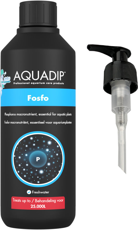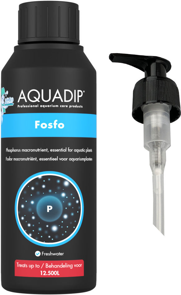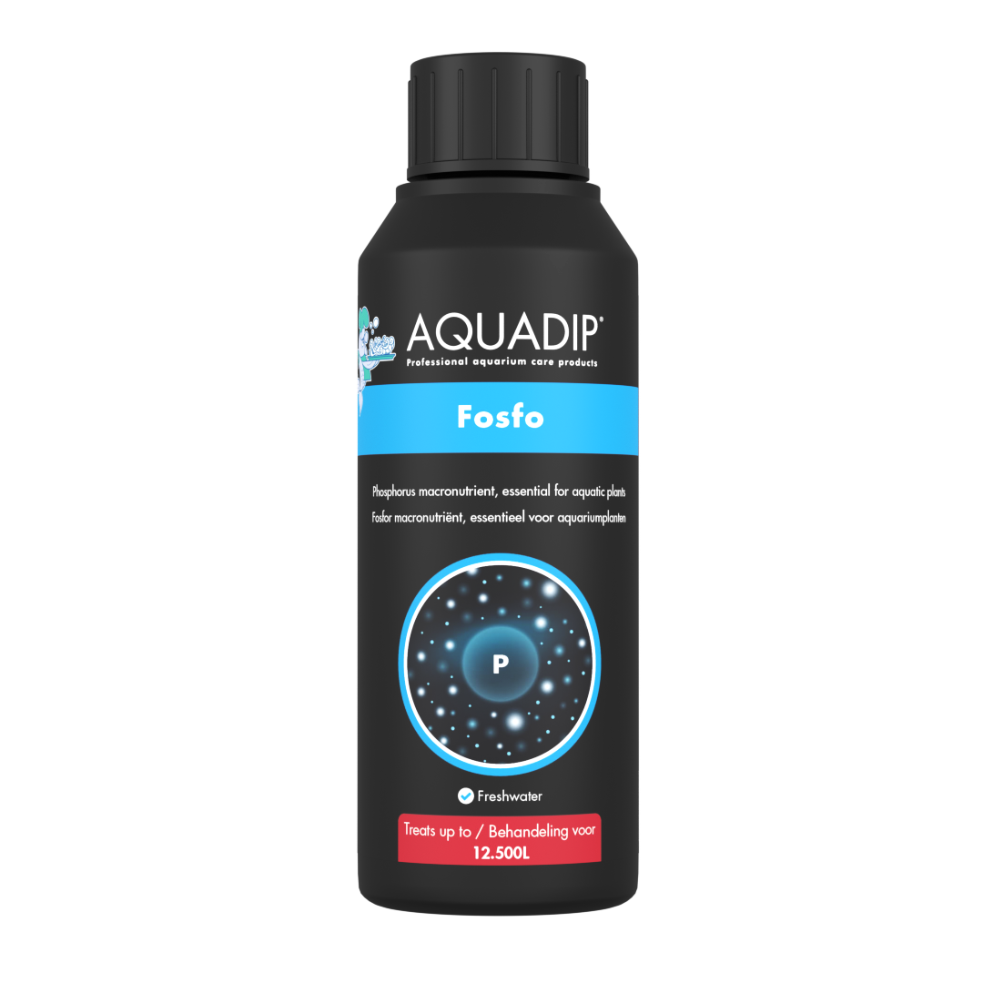 Phosphorus (P) is one of the three essential NPK macronutrients for aquatic plants. Left over fish food and fish excrement normally take care of phosphate values in your tank. AQUADIP Fosfo is ideal for heavily planted aquariums with a high light intensity and with none to a few fish.