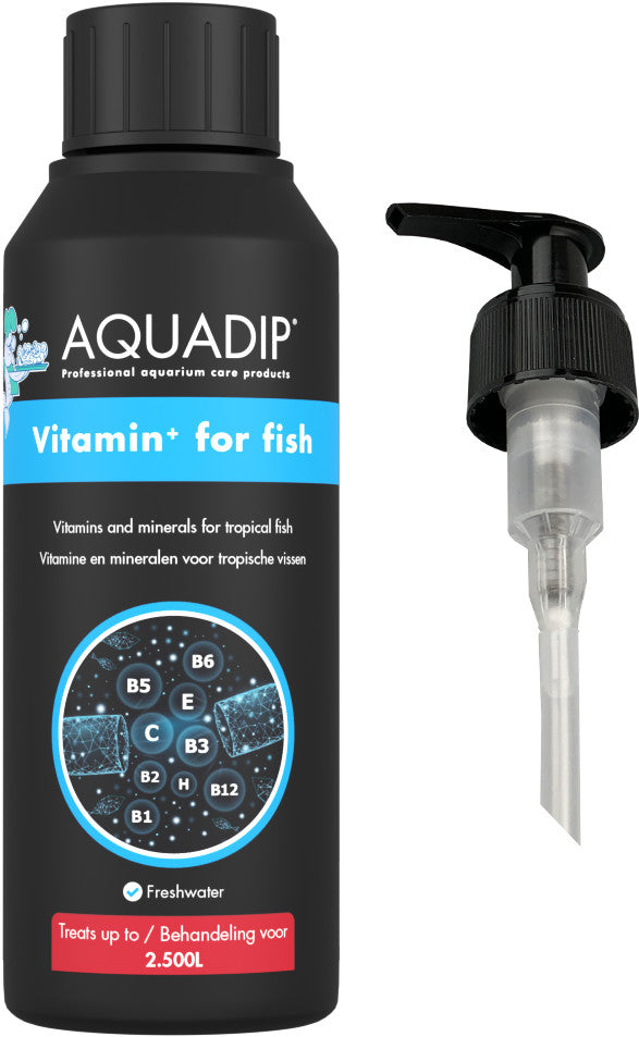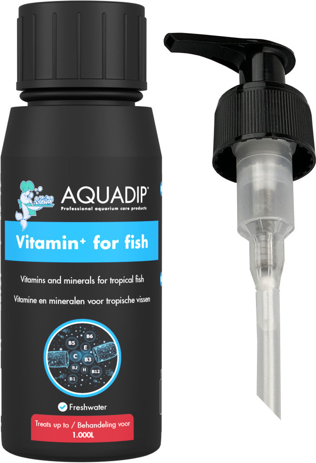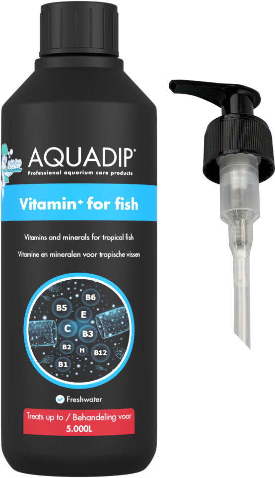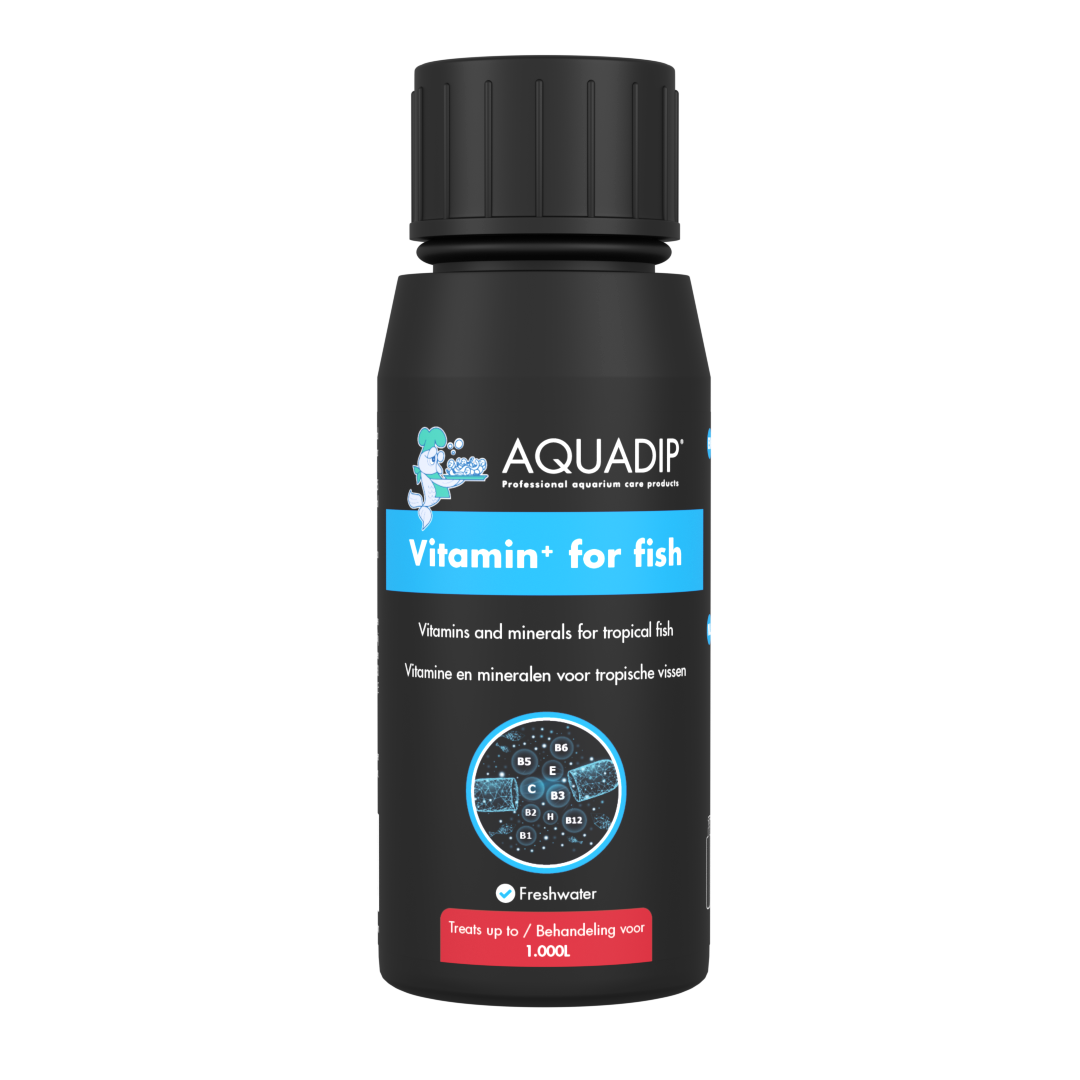 AQUADIP Vitamin⁺ for fish is a natural product containing multiple vitamins and minerals. This mix prevents deficiency symptoms and diseases which might occur when there is a long-term lack of vitamin. It is an easy way to fill the nutritional gaps for your fish.