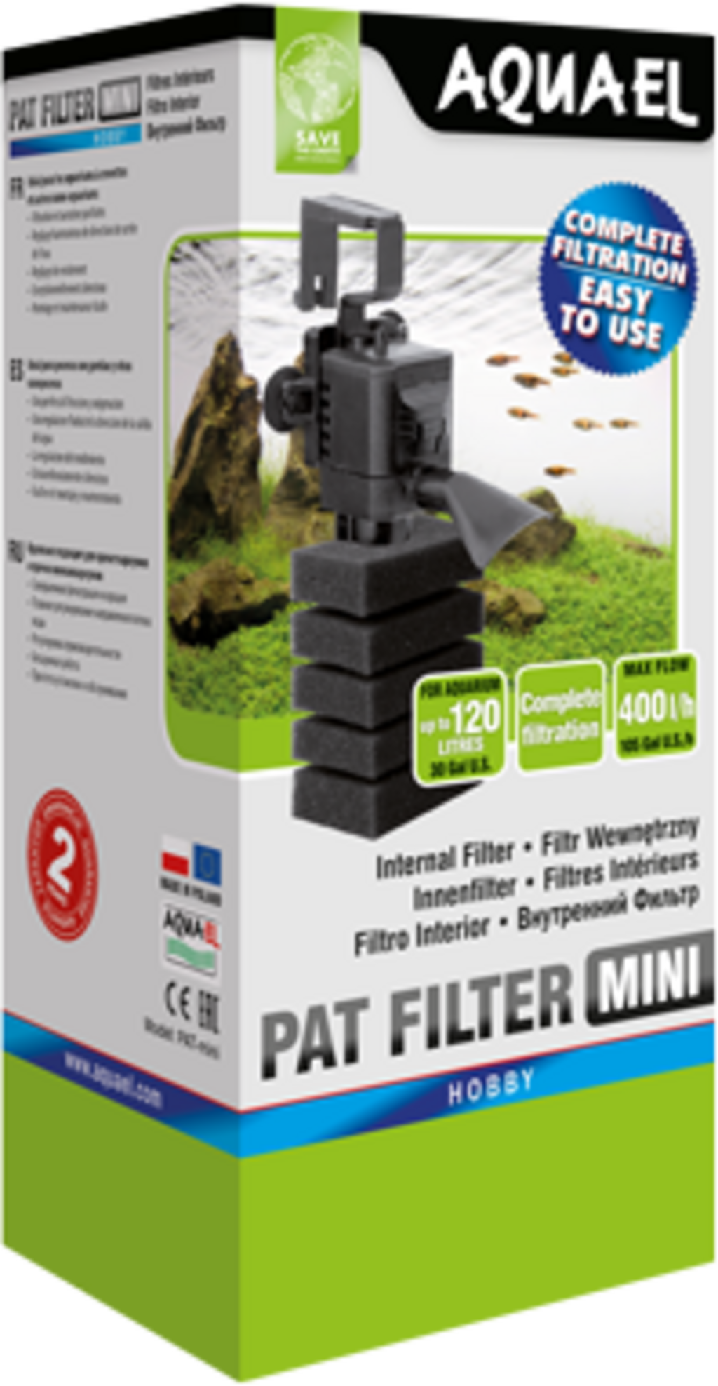 The AQUAEL PAT MINI, a miniature turbine filter, is intended for small freshwater aquariums. This device consists of a tiny head and a carefully selected filter sponge. Thanks to the use of innovative design solutions, the head has a maximum capacity of up to 400 l / h, which corresponds to a typical medium-sized turbine aquarium filter. And all of this with an energy consumption of no more than 4W.
