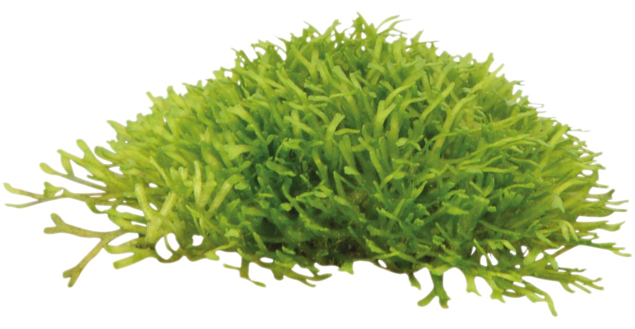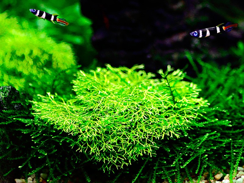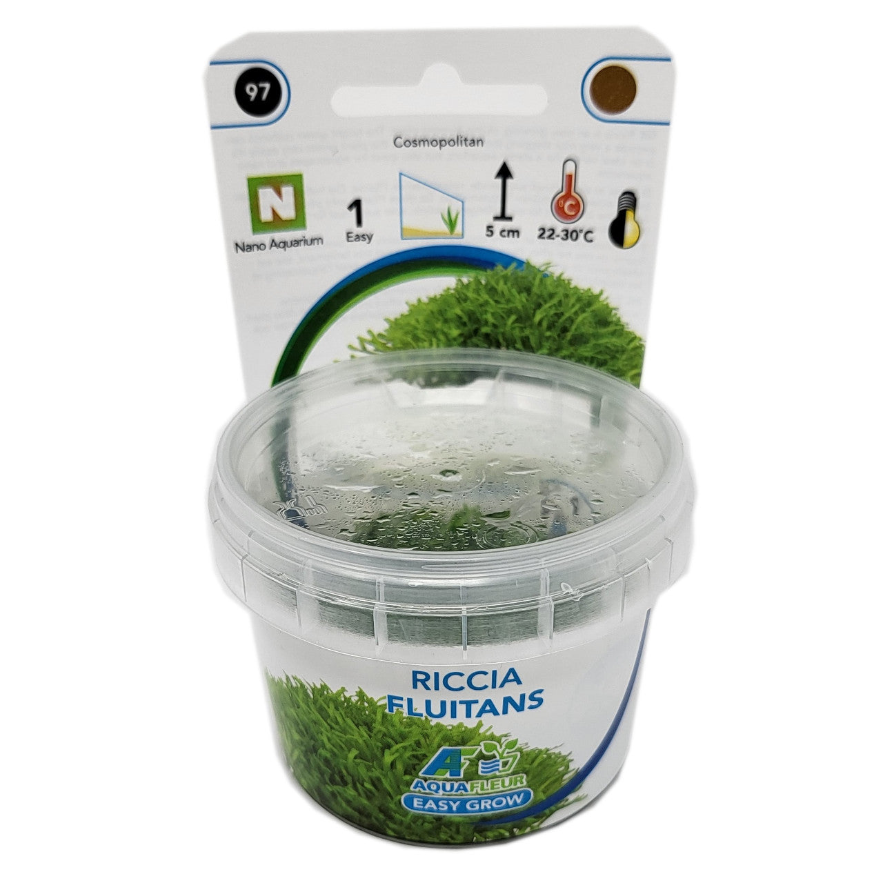 Japanese Takashi Amano has inspired many aquarium owners to keep the 1-5 cm tall cosmopolitic moss, Riccia fluitans, submerged. It can be kept down by tying it to a stone with a piece of fishing line, but new shoots always grow towards the surface, so it may be necessary to prune it with scissors. Riccia fluitans thrives best with added CO2 and in good growing conditions small oxygen bubbles form on the leaf tips. As a traditional, floating plant offers good protection for young fish.