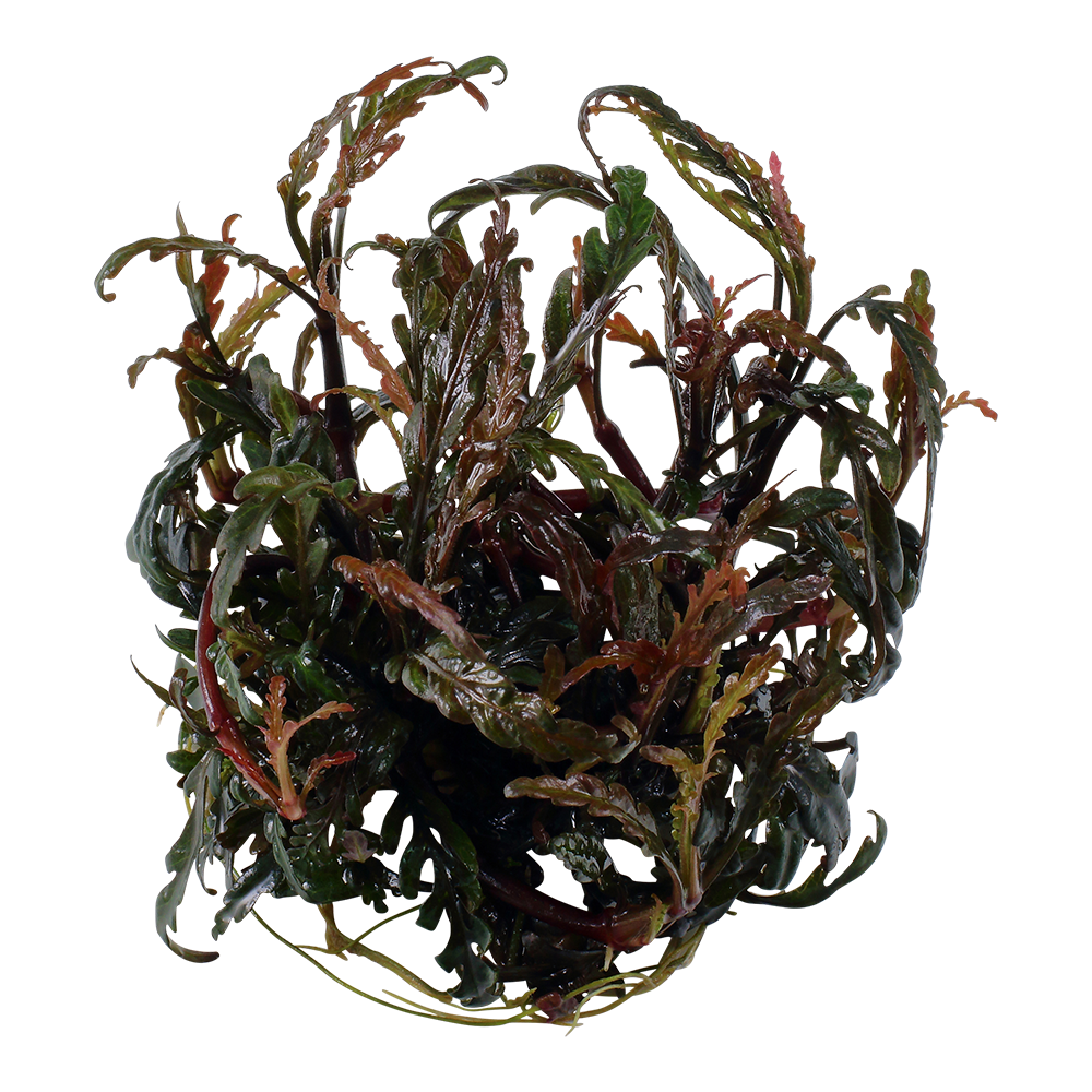 Hygrophila pinnatifida originates from India. It obtains brown, patched leaves on the surface with a distinctive burgundy colour underneath. It creates horizontal side shoots and the top shoots should be pinched out in order to maintain compact and attractive growth. The horizontal side shoots easily attach to both wood and rocks. Growth is moderate, stems 15-40 cm tall and 10-20 cm wide, and the colour is attractive when planted in small groups with a plain background. Intense lighting ensures compact growth due to the plant's slow to medium growth rate.
