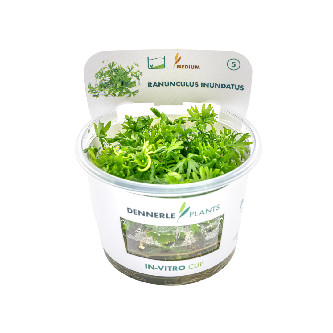 This species comes from Australia and gets 5-10 cm tall. There are many species and variants of Ranunculus, which grow coarse and leggy in aquariums. Ranunculus inundatus is characterised by its compact form and distinguished, deep-lying umbrellas. The plant forms many vertical runners with new plants and over time thick bottom coverage is formed. Good lighting produces compact growth. Long leaves can be pruned.