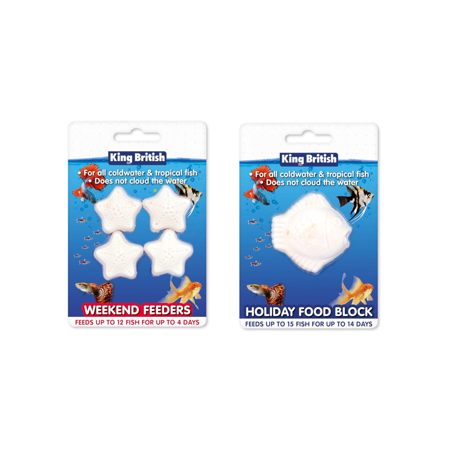 King British Weekend Feeders (4 blocks per pack) are suitable for all coldwater & tropical fish. They are small starfish-shaped blocks made from a calcium matrix that slowly dissolve to release fish food into the water. Each block lasts up to four days, making them ideal to feed your fish if you are away for a long weekend. Suitable for 12 small tropical fish or 5 medium size goldfish.