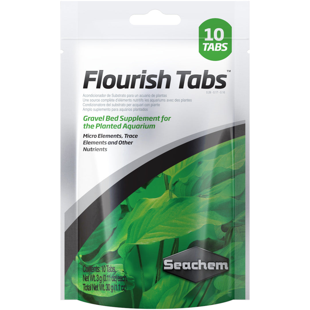 Flourish Tabs are growth stimulating tablets for plant roots. They contain essential trace elements, amino acids, and vitamins. They are rich in iron, manganese, magnesium, calcium, potassium, inositol, choline B12, biotin, and other factors that have been determined to be beneficial to aquatic plant roots. They contain no phosphate or nitrate that would promote algae proliferation. Each pack of ten tablets treats a 12 x 30 inch plant bed twice.