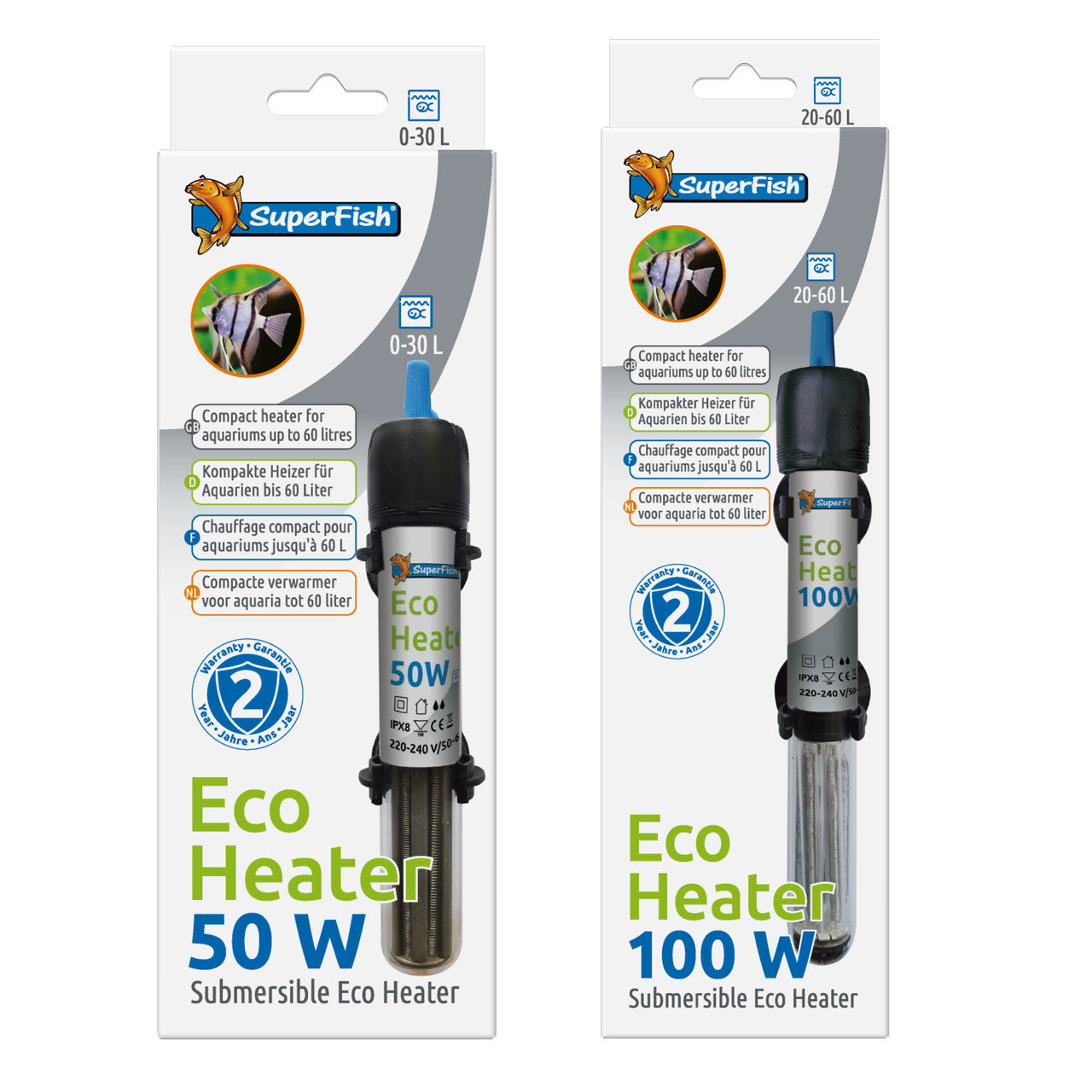 The Superfish Eco Heaters are submersible mini-heaters for small aquariums. The thermostat is sensitive and reliable maintaining a uniform temperature. The heating element is compact and highly efficient.