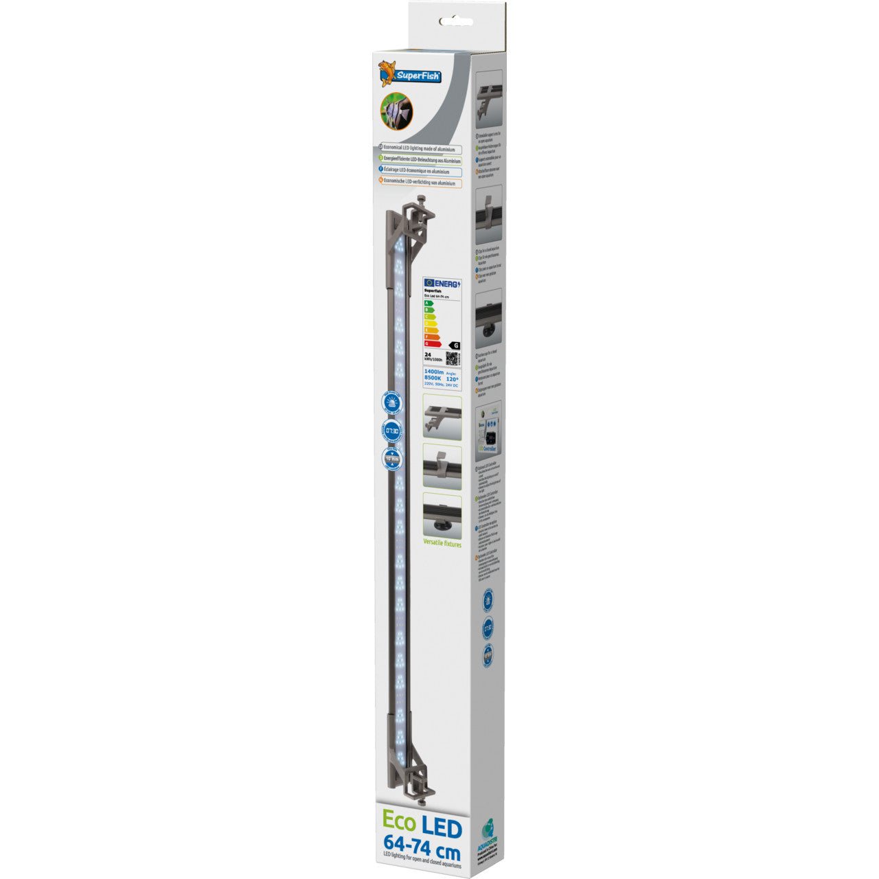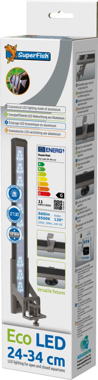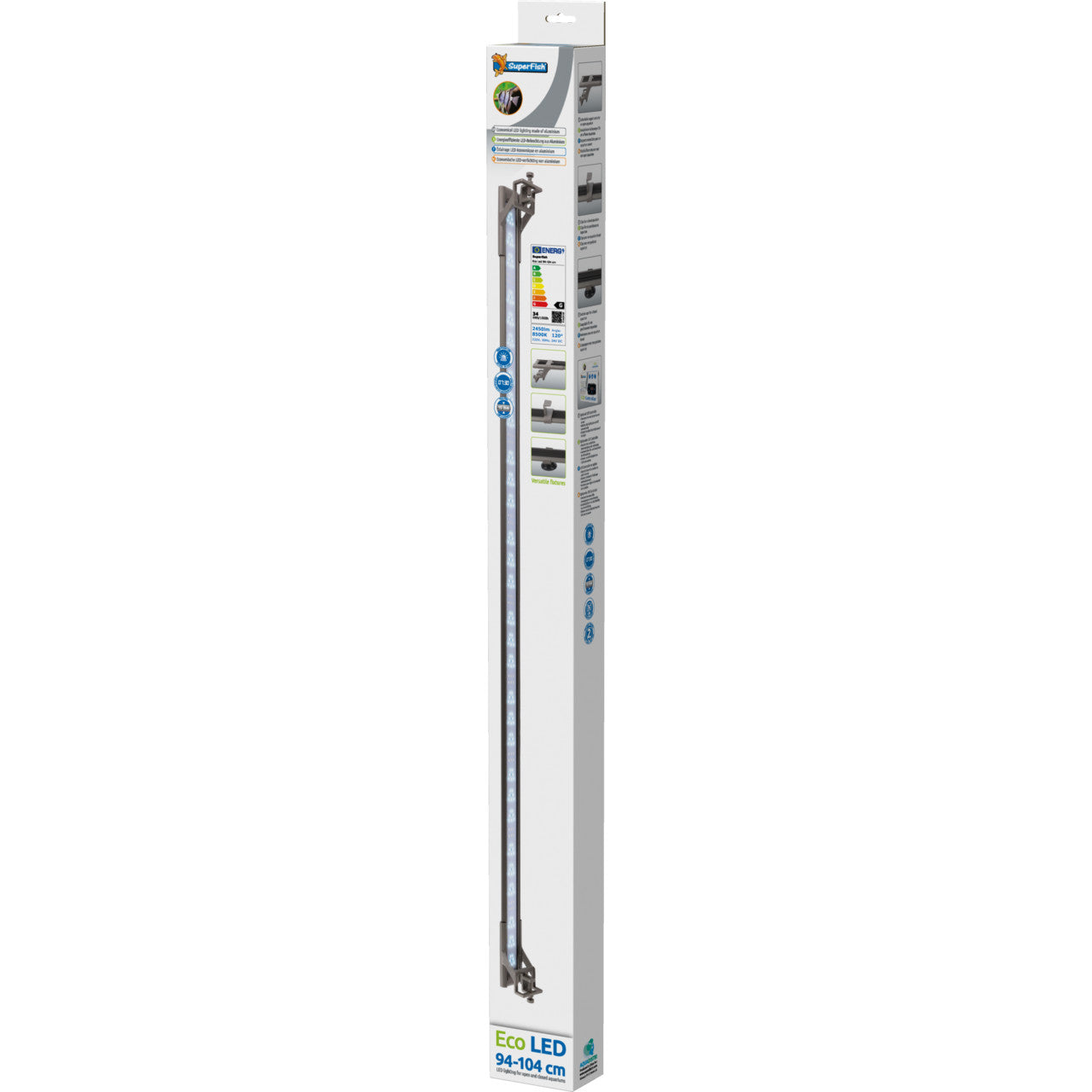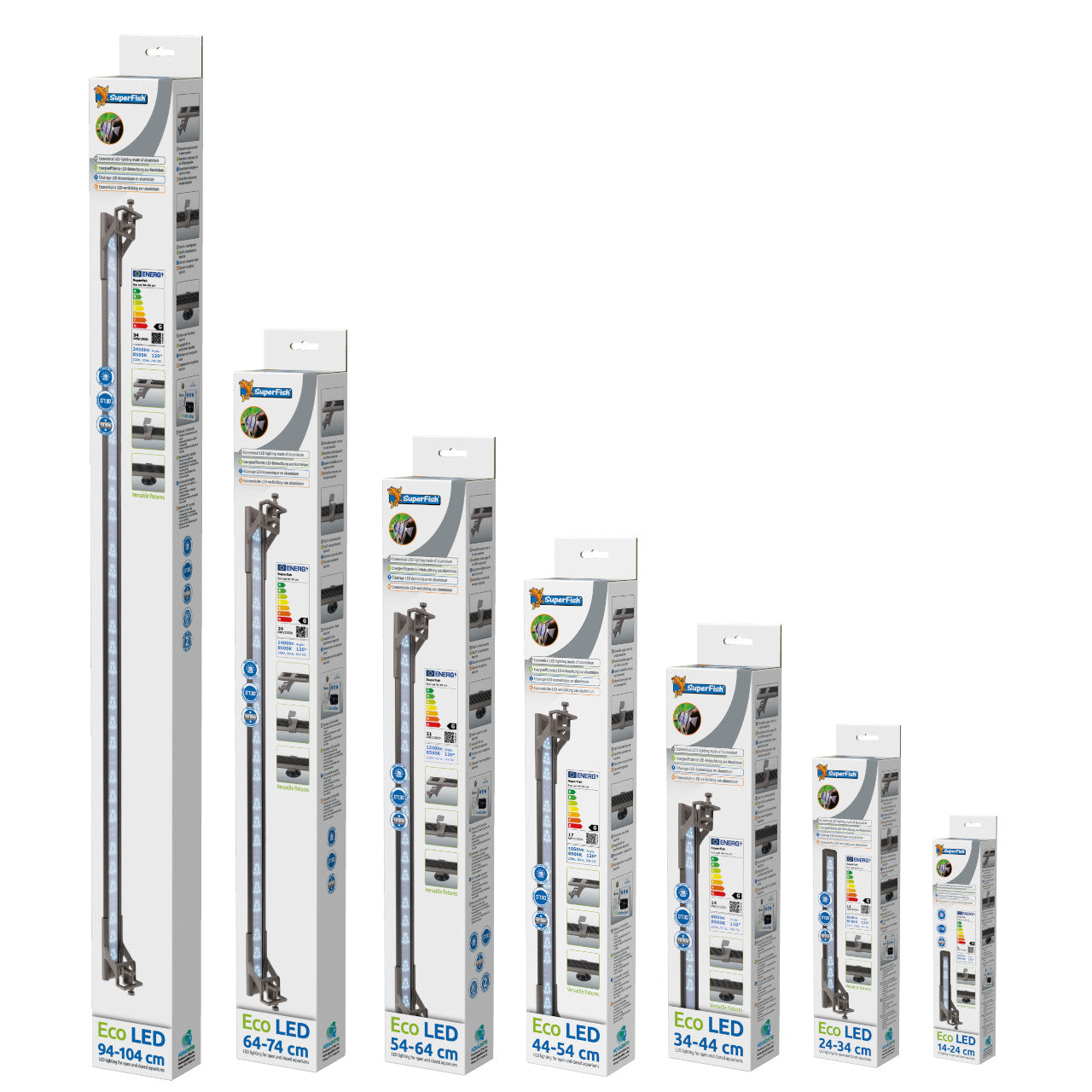 SuperFish Eco LED: cost-effective LED lighting with a robust aluminum housing, suitable for both open and closed aquariums. Features high-power LEDs with a long lifespan of 30,000 hours and an easy-to-install 1.8-meter cable with an on/off switch.