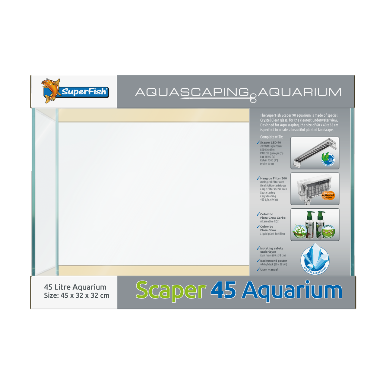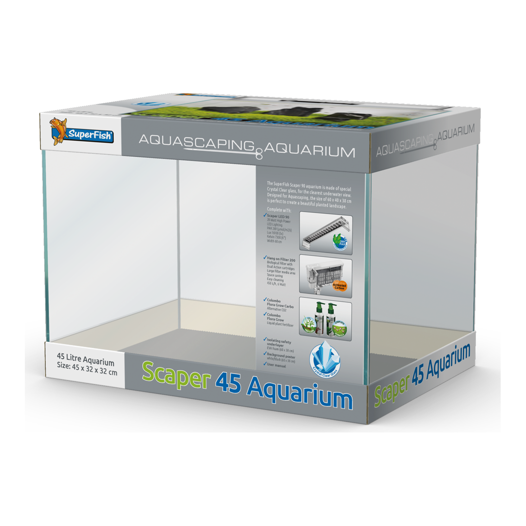 Superfish Scaper aquariums are open-top and made of Crystal Clear glass, which ensures a crystal clear underwater image. The three models have been specifically developed for Aquascaping, so the dimensions are perfect for creating beautifully planted underwater landscapes.