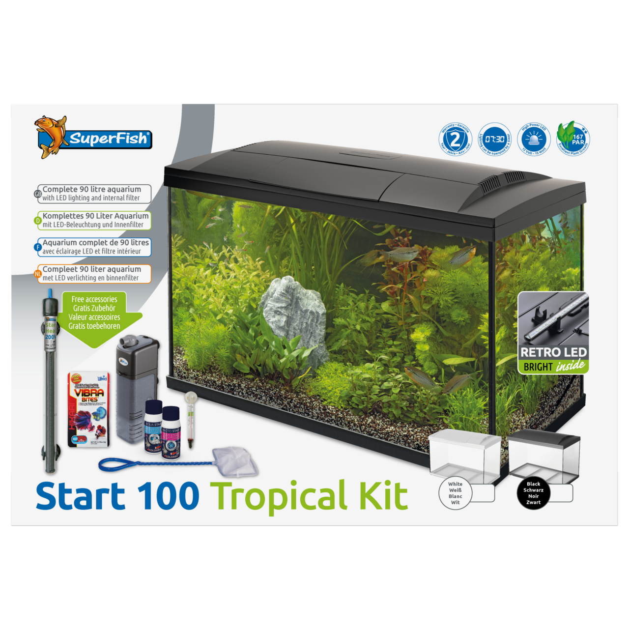 This is a modern 105L complete setup with LED lighting, internal filter, heater and a range of accessories including water conditioner, fish food, fish net and thermometer.