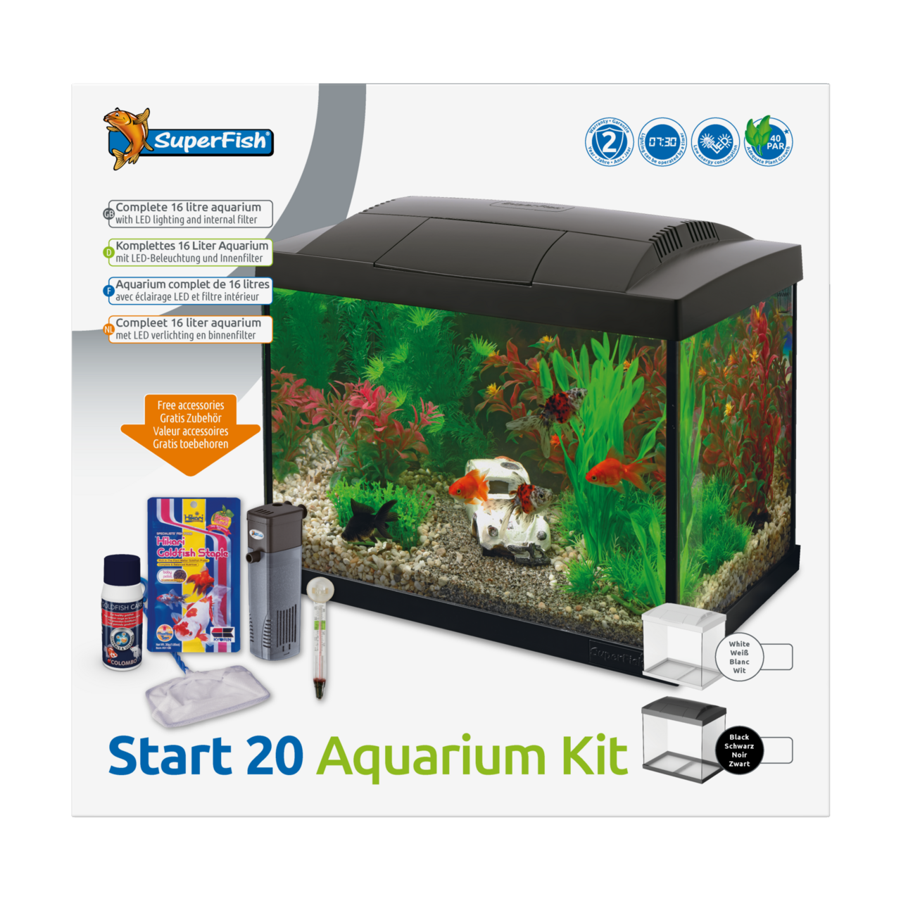 This is a modern 16L complete setup with LED lighting, internal filter and a range of accessories including water conditioner, fish food, fish net and thermometer.