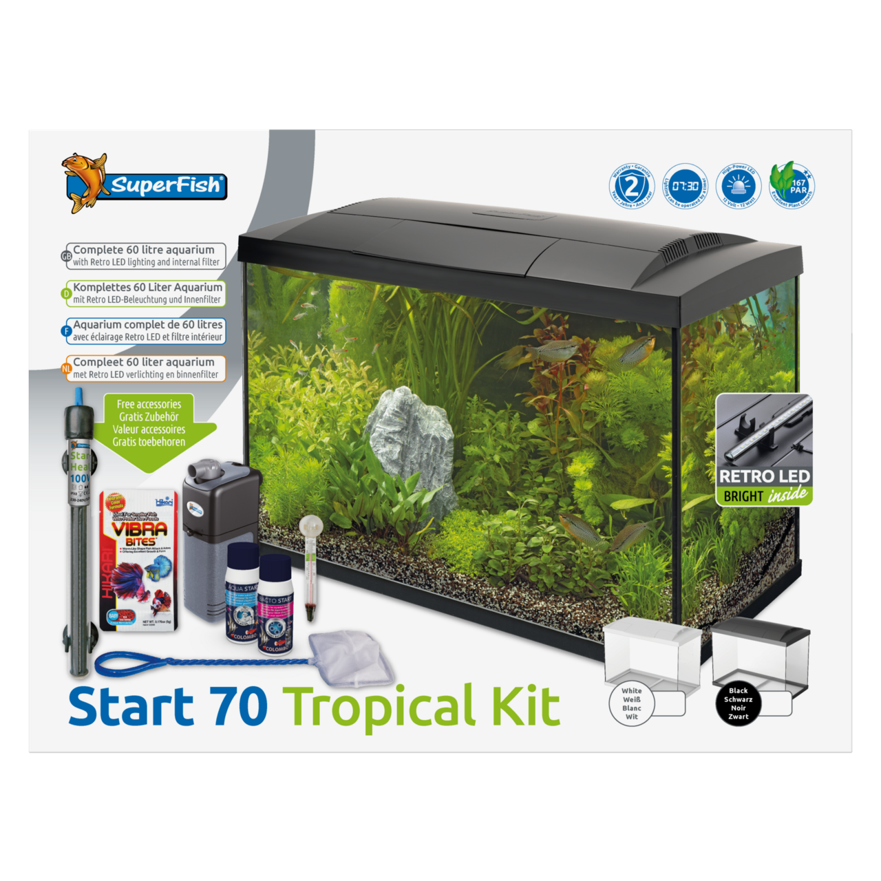 This is a modern 60L complete setup with LED lighting, internal filter, heater and a range of accessories including water conditioner, fish food, fish net and thermometer.