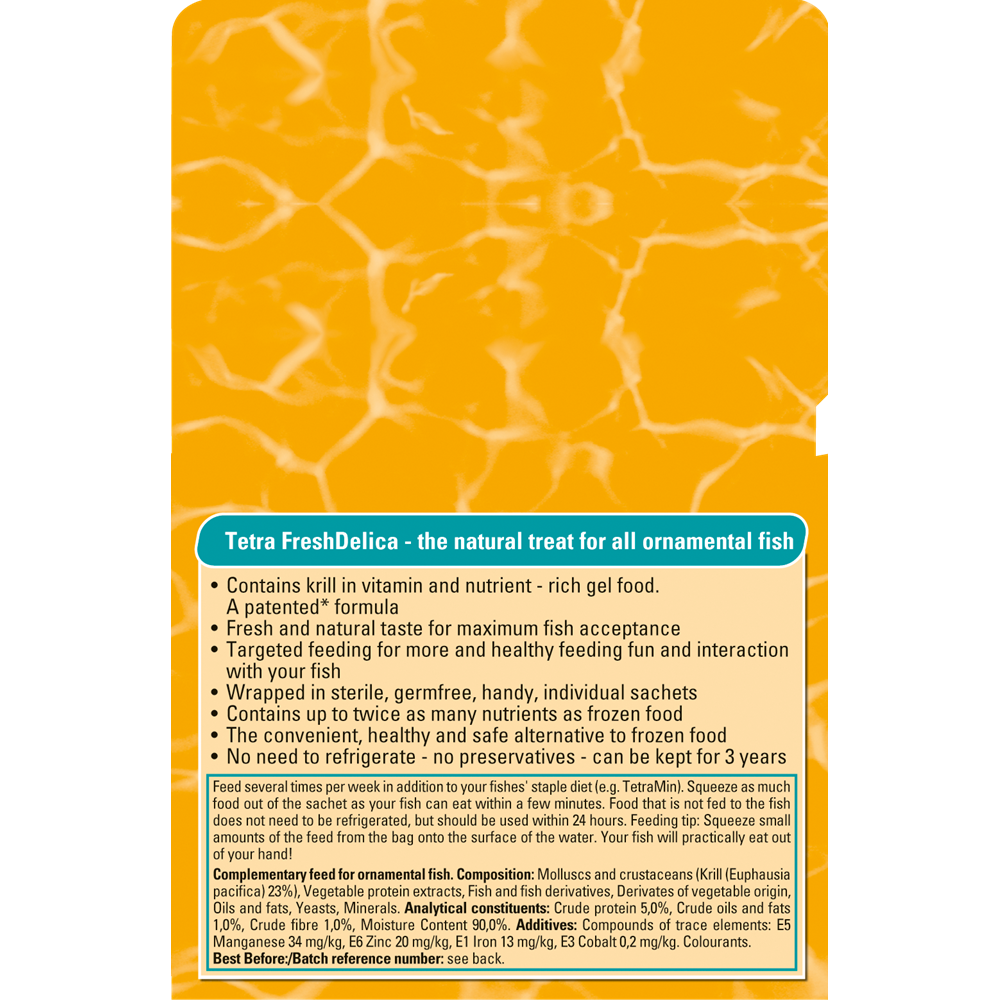 Tetra Fresh Delica Krill are the perfect treat for your fish. No longer do you have to worry about messy and inconvenient frozen foods. These squeezable sachets offer the same freshness and nutritional benefits without the need for freezing or handling. Each pack contains 16x 3g sachets enriched with vitamins and nutrients.
