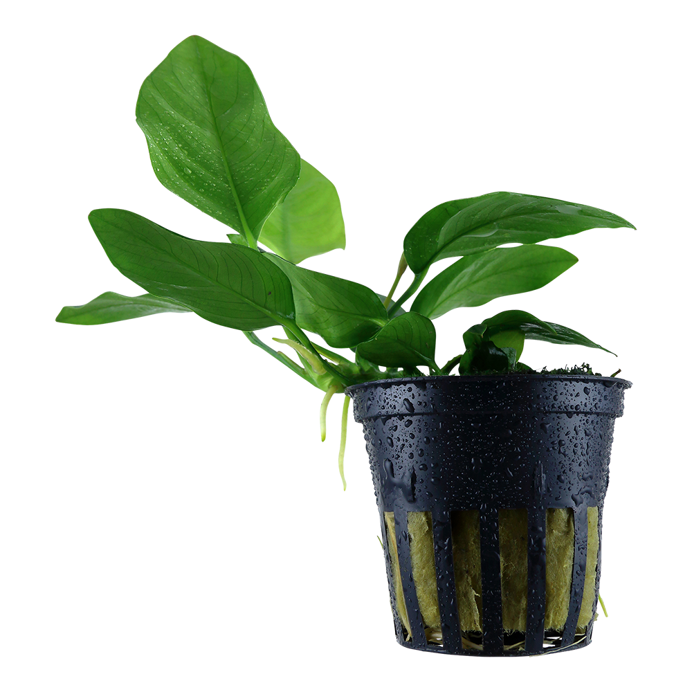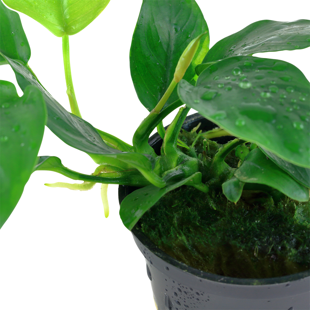 Anubias barteri var. nana is a small, attractive plant which thrives in all conditions. It originates from Cameroon and will reach 5-10 cm height. The rhizome will be 10-15 cm or more. It grows slowly, and the leaves survive for several years, giving slow-growing algae the chance to become established. The best result is achieved by planting on a stone or tree root. Fishing line can be used to attach the plant until it gains a hold. If planted on the bottom the rhizome must not be covered because it tends to rot. It flowers frequently under water. It is not eaten by herbivorous fish.