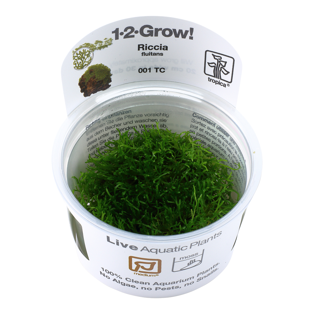 Japanese Takashi Amano has inspired many aquarium owners to keep the 1-5 cm tall cosmopolitic moss, Riccia fluitans, submerged. It can be kept down by tying it to a stone with a piece of fishing line, but new shoots always grow towards the surface, so it may be necessary to prune it with scissors. Riccia fluitans thrives best with added CO2 and in good growing conditions small oxygen bubbles form on the leaf tips. As a traditional floating plant offers good protection for young fish.